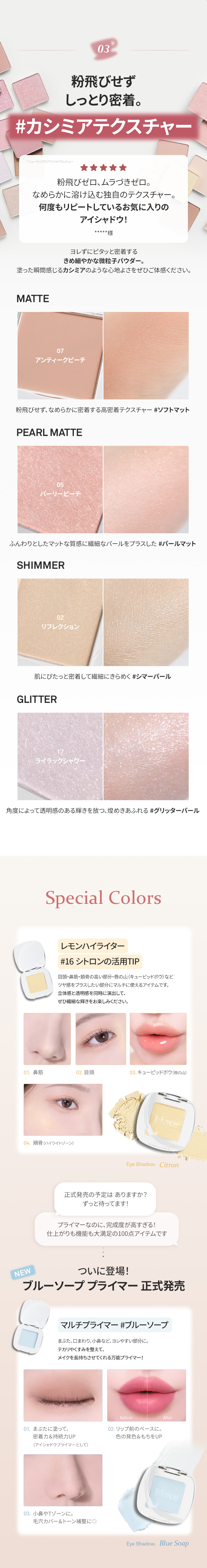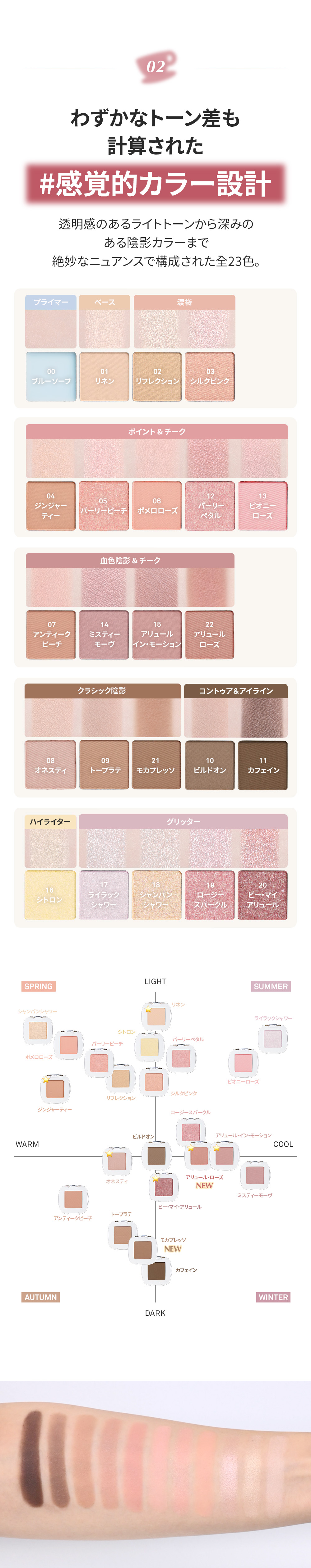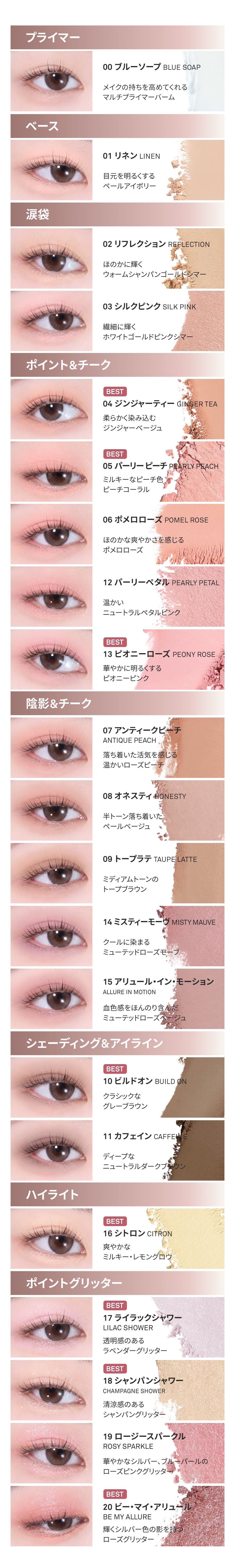 【21モカプレッソ】 タルク、マイカ、オクテニルコハク酸デンプンAl、酸化鉄、トリ(カプリル酸/カプリン酸)グリセリル、窒化ホウ素、酸化チタン、ミリスチン酸Mg、ステアリン酸Mg、マンガンバイオレット、カプリリルグリコール、カプリル酸グリセリル、トリエトキシカプリリルシラン、ジメチコン、エチルヘキシルグリセリン、黄4、カルミン、水酸化Al、カオリン、マルトデキストリン、トコフェロール