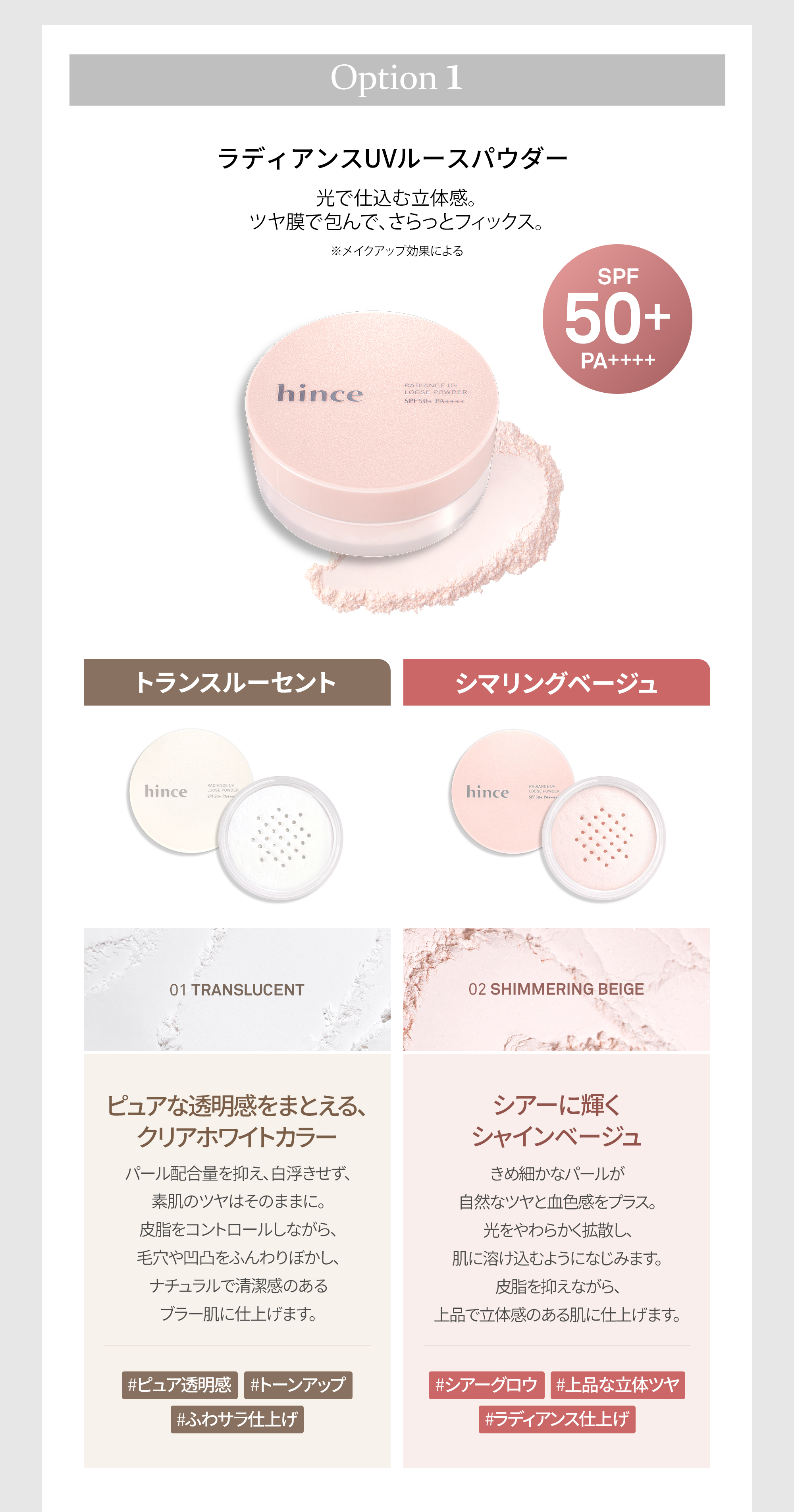 【ラディアンスUVルースパウダー】 付属のベルベットパフに適量を取り、軽くなじませてから、肌にやさしくタップするようにのせてください。メイクの仕上げとして顔全体に使用するのはもちろん、皮脂やテカリが気になる部分へのポイント使いにもおすすめです。