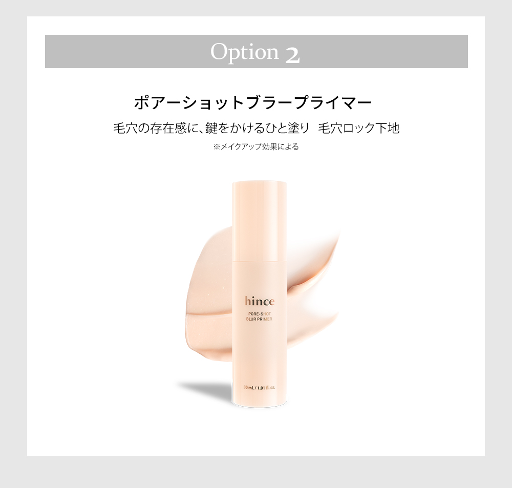 【ポアショットブラープライマー】 適量(1プッシュの半分程度)を指先に取ります。毛穴や凹凸が気になる部分に、こすらず軽くトントンと叩き込むようになじませてください。なじませた後、いつも通りファンデーションやクッションを重ねてベースメイクを仕上げてください。