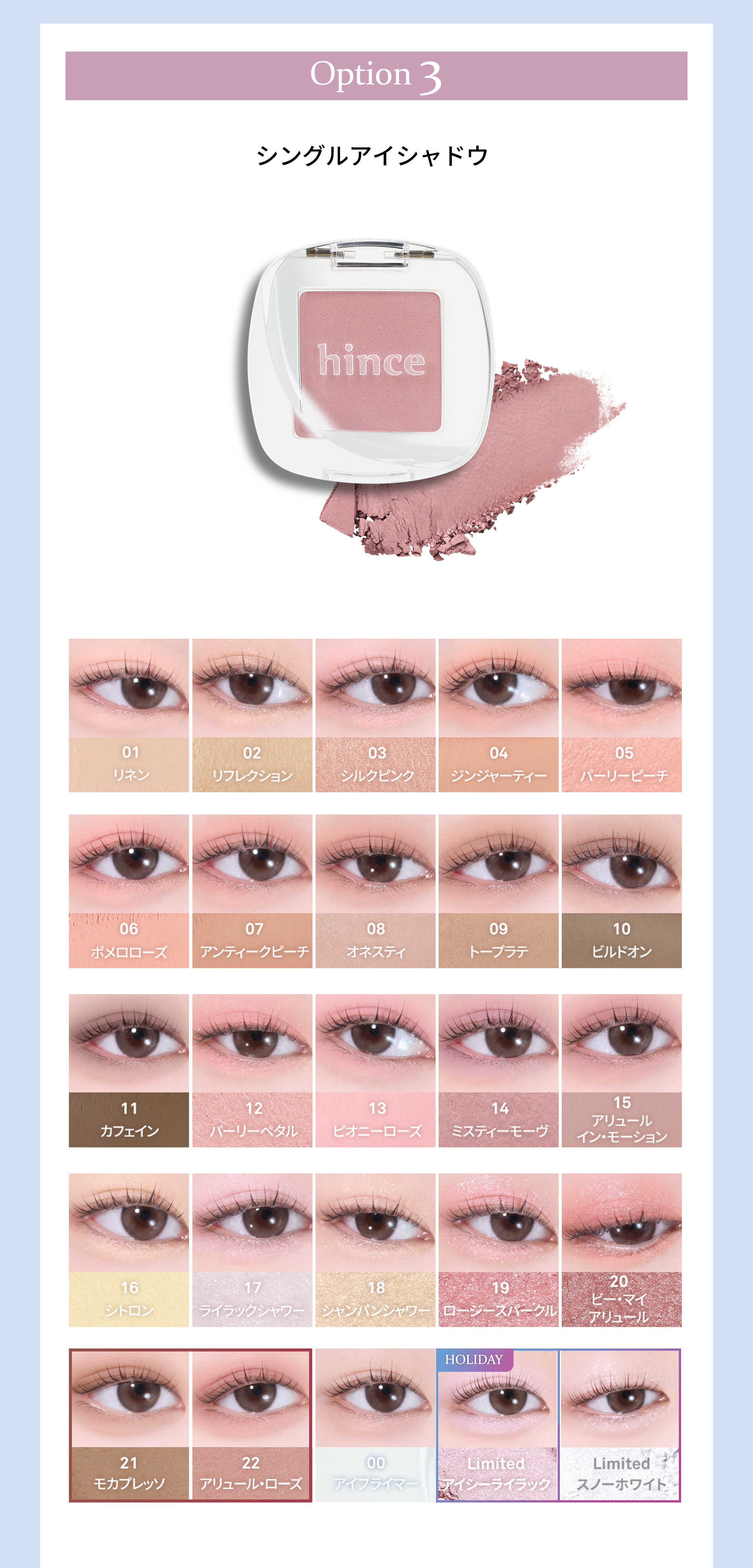 なお、シングルアイシャドウ 03 シルクピンク、05 パーリーピーチ、06 ポメロローズ、07 アンティークピーチ、09 トープラテ、11 カフェイン、12 パリーペタル、13 ピオニーローズ、14 ミスティーモーヴ、15 アリュール・イン・モーション、17 ライラックシャワー、 19 ロージースパークル、20 ビー・マイ・アリュール、【Rose Presso Collection】21モカプレッソ、【Rose Presso Collection】22 アリュール・ローズ、【Snow Flower Collection】アイシーライラック はカルミンを使用しています。