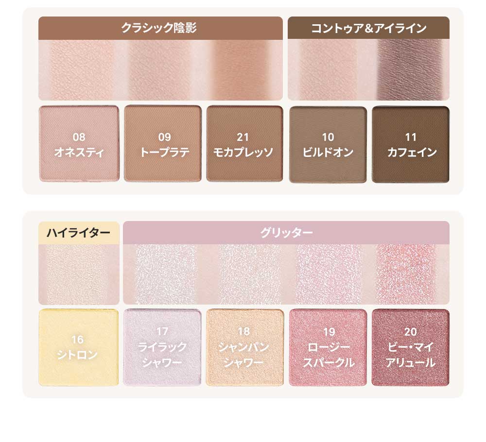 タルク、オクテニルコハク酸デンプンAl、酸化チタン、窒化ホウ素、トリ(カプリル酸/カプリン酸)グリセリル、シリカ、酸化鉄、ステアリン酸Mg、マカデミア種子油、ジメチコン、マンガンバイオレット、カルミン、トリエトキシカプリリルシラン、カプリリルグリコール、カプリル酸グリセリル、水酸化Al、エチルヘキシルグリセリン、黄4、カオリン、マルトデキストリン、トコフェロール