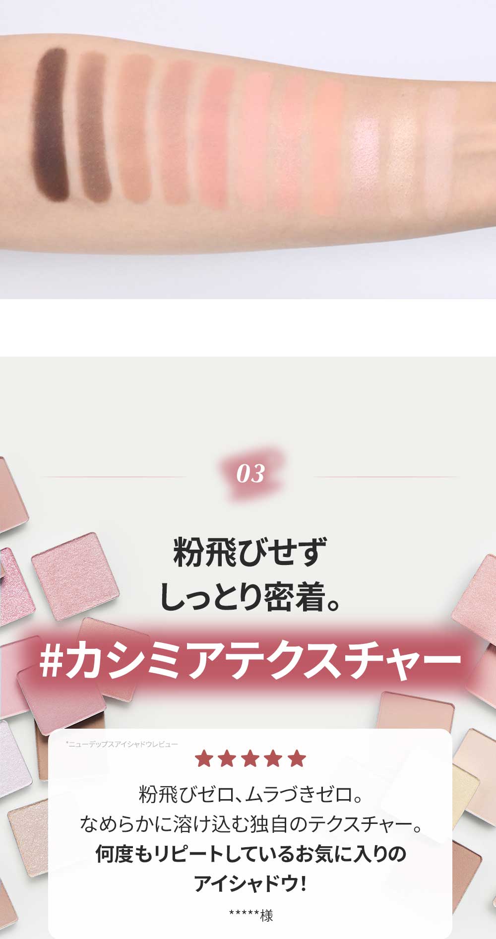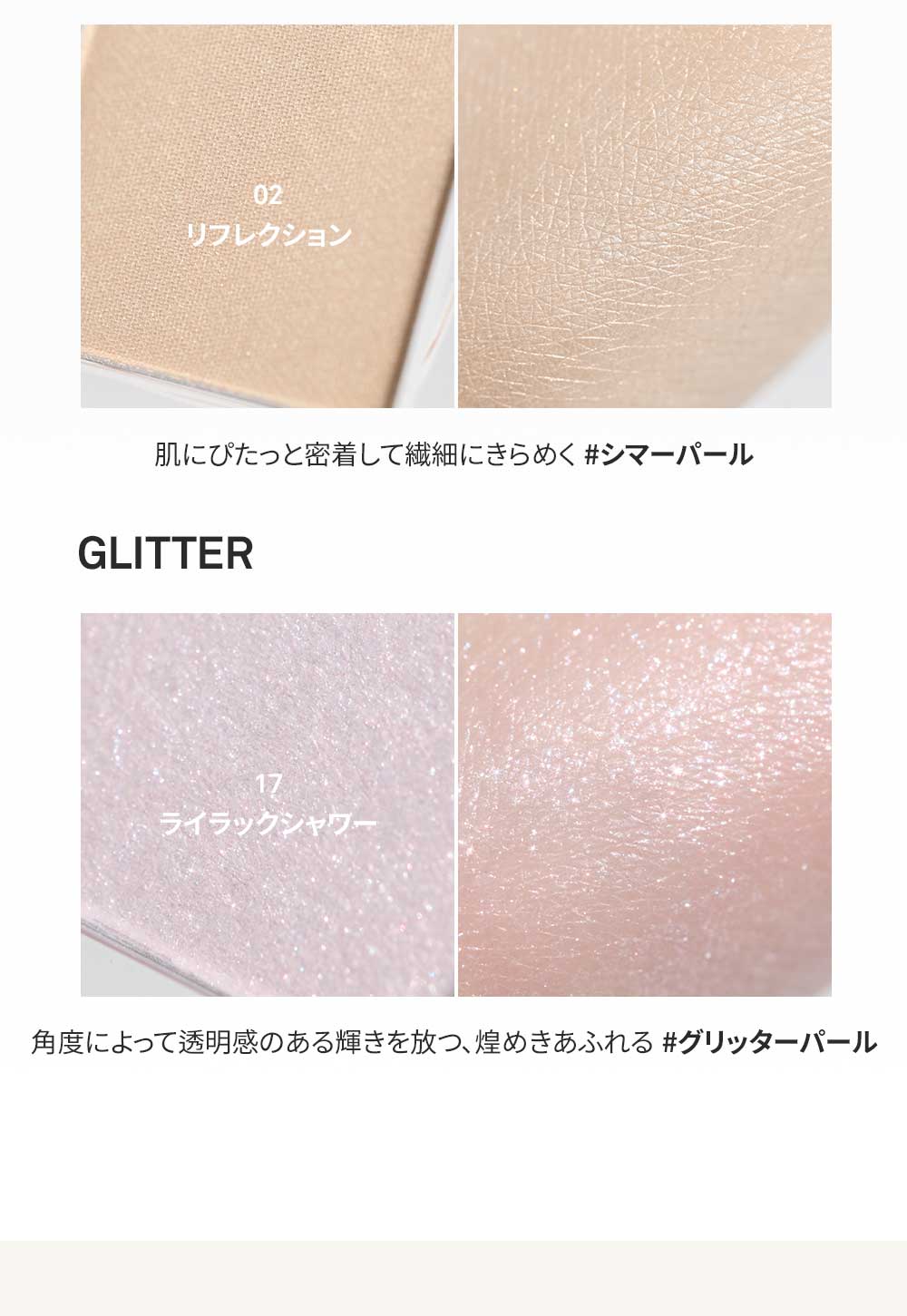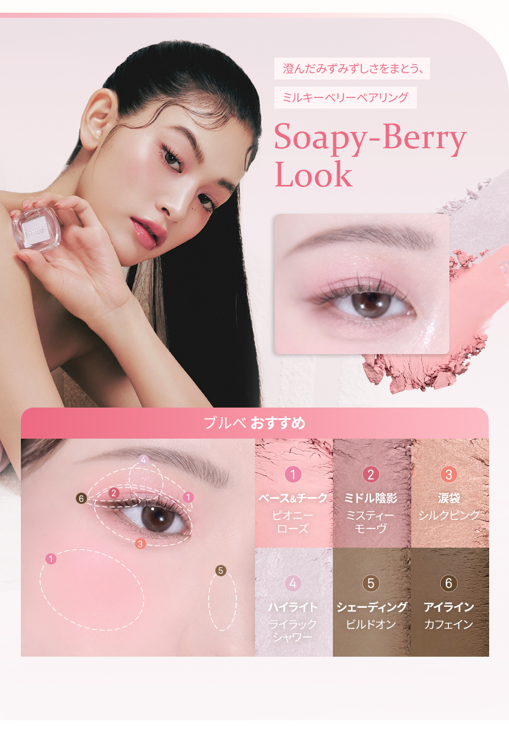 タルク、オクテニルコハク酸デンプンAl、シリカ、トリ(カプリル酸/カプリン酸)グリセリル、酸化チタン、マンガンバイオレット、酸化鉄、窒化ホウ素、ステアリン酸Mg、マカデミア種子油、ジメチコン、カルミン、カプリリルグリコール、トリエトキシカプリリルシラン、カプリル酸グリセリル、エチルヘキシルグリセリン、カオリン、水酸化Al、マルトデキストリン、トコフェロール