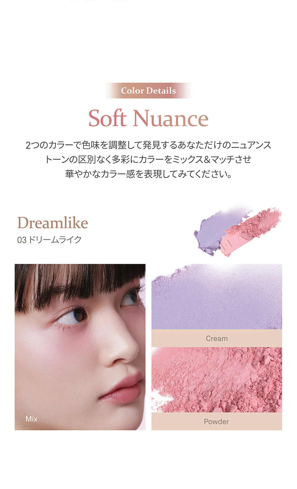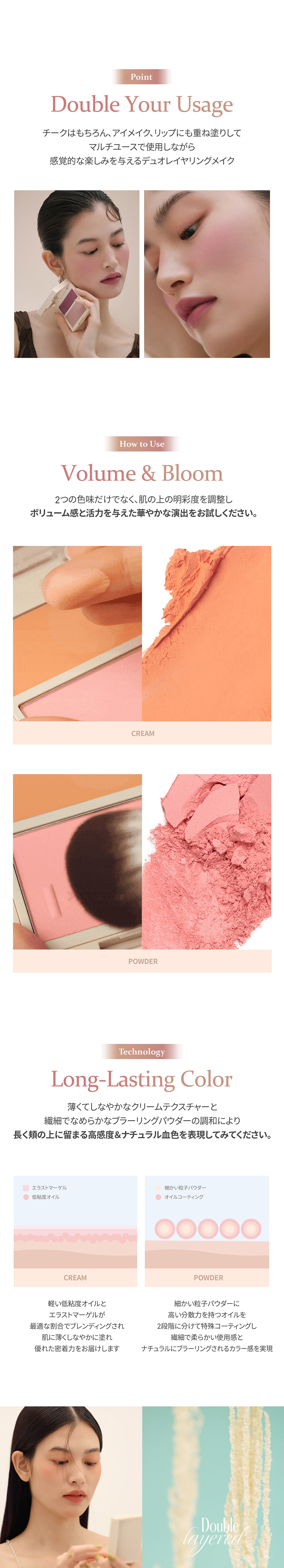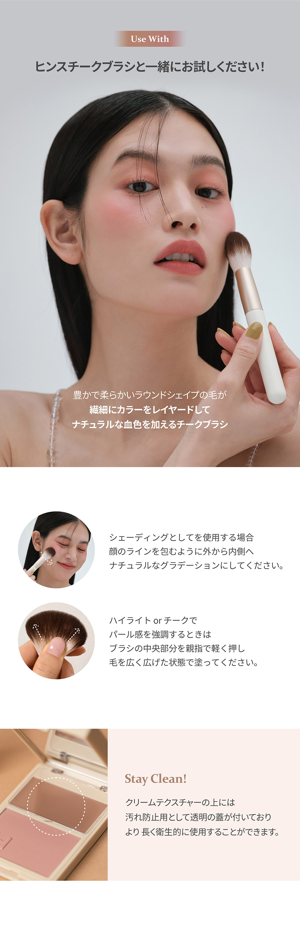 ファンデーションの後、ブラシやパフ、指などに適量をとり、頬などにのせてください。 クリームの上にパウダーを重ねると、肌に密着してもちが良くなります。