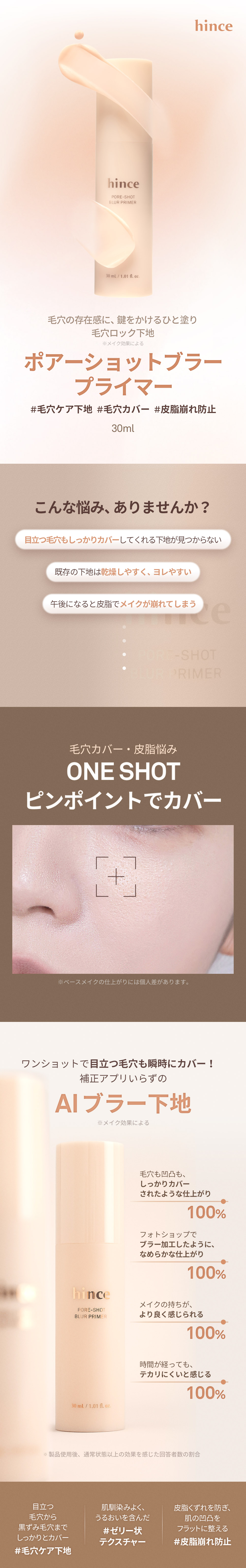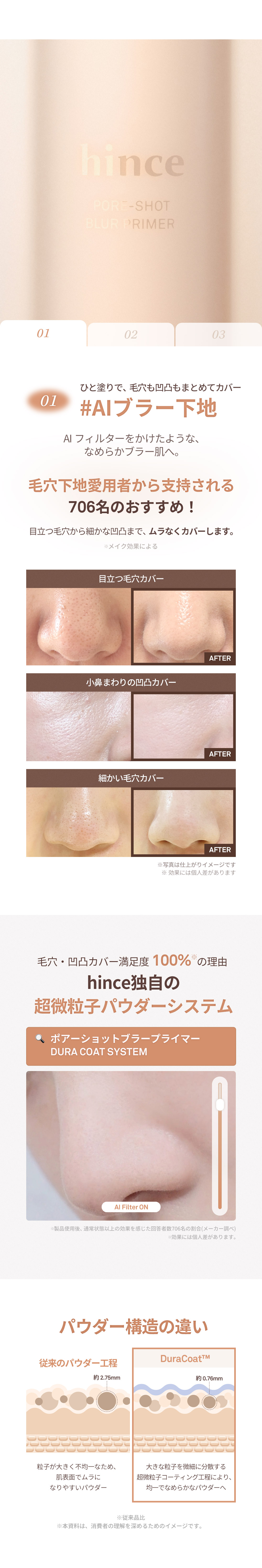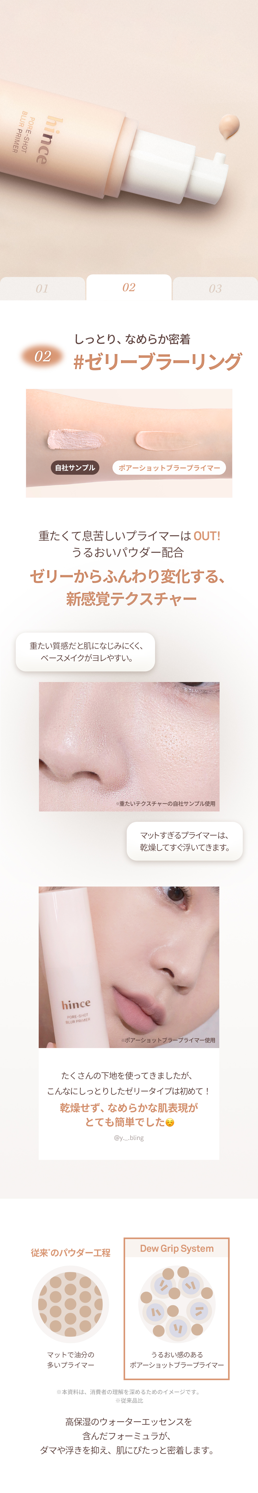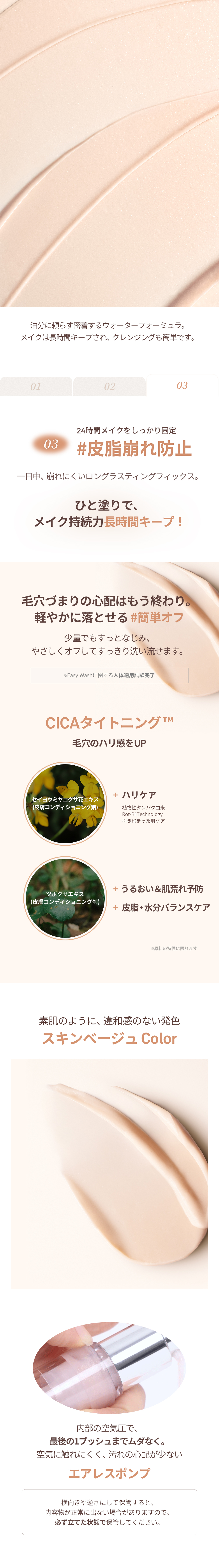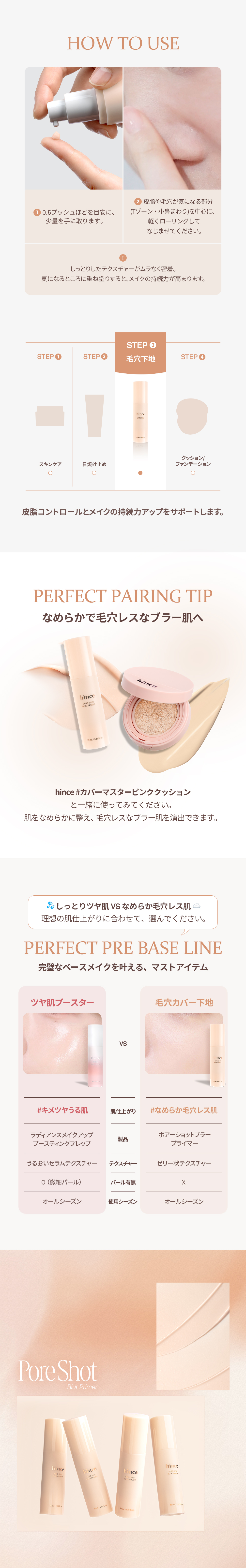 STEP 1 適量(1プッシュの半分程度)を指先に取ります。 STEP 2 毛穴や凹凸が気になる部分に、こすらず・軽くトントンと叩き込むようになじませてください。※小鼻・頬・Tゾーンなど、気になる部分への部分使いがおすすめです。 STEP 3 なじませた後、いつも通りファンデーションやクッションを重ねてベースメイクを仕上げてください。